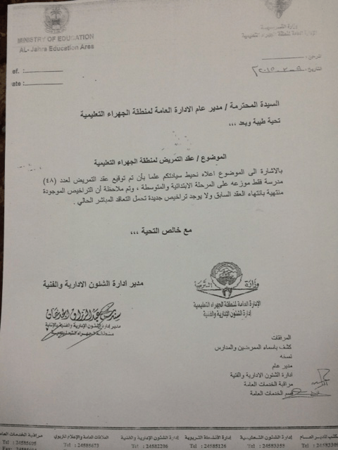وهذا الكتاب يؤكد بوجود (48) مدرسة بها ممرضين وممرضات منتهية تراخيصهم الخاصة بمزاولة المهنة داخل وزارة التربية، وهو ما يؤكد صحة ما تم نشره بأن منطقة الجهراء تحتل المراكز الأولى في التجاوز الخاص بعقد التمريض المذكور.