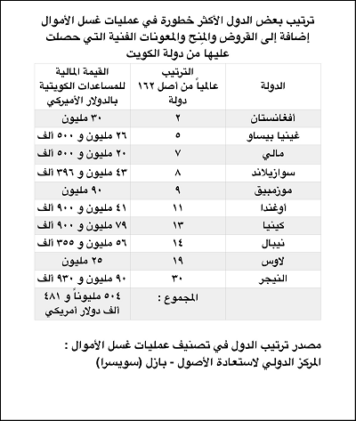 ما سبق أمثلة لبعض الأموال الكويتية التي تُقرض وتُمنح لبعض الدول وليست كلها التي تتصدر التصنيفات العالمية ضمن الدول الأكثر تعرّضا وخطورة لعمليات “غسل الأموال”