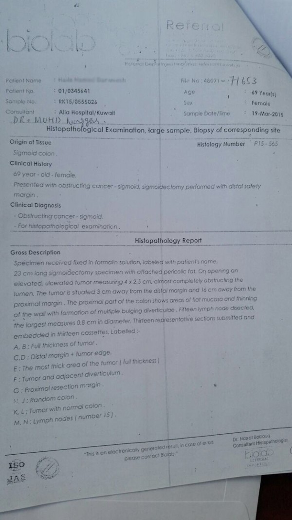 وأضاف: “عملت عملية جراحية لاستئصاله من القولون، وبعد أخذ عينات منه تبيّن أن الخلايا السرطانية تعدّت إلى الغدد الليمفاوية، مما يؤدي إلى تكوينه من جديد.”