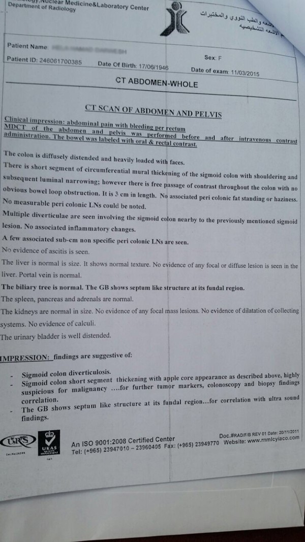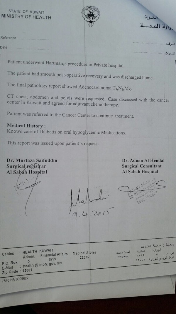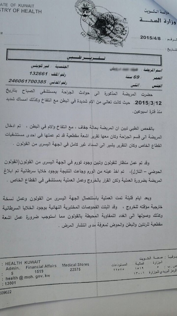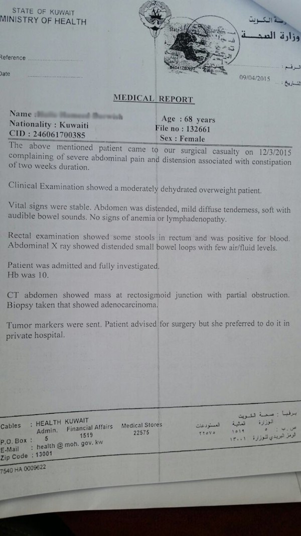وقال كذلك: “قرر الأطباء بمستشفى الصباح بتحويلها لمستشفى الشيخة بدرية الأحمد الصباح قسم وحدة الكيماوي، ولا يخفى عليكم أن العلاج بالكيماوي بسن 69 سنة سلبياته أكثر من ايجابياته على الجسم.”