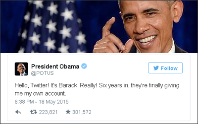 وكتب أوباما في أولى تغريداته على الحساب (@POTUS): “مرحبا مجتمع تويتر، إنه باراك حقا، أخيرا وبعد 6 سنوات حصلت على حسابي الشخصي”، وجرت إعادة تغريدها أكثر من 190 ألف مرة تقريبا في أقل من 9 ساعات، بحسب موقع “سكاي نيوز”.