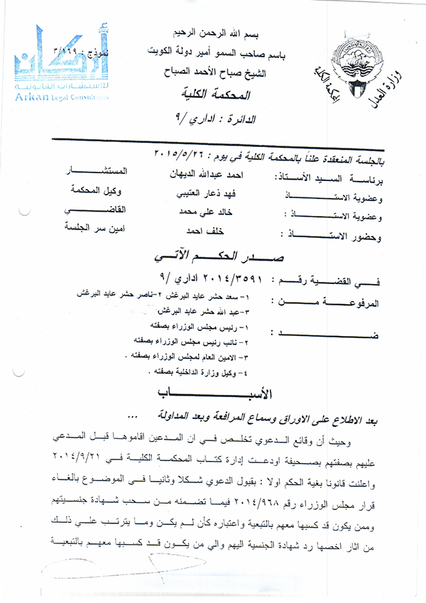 نشرت مجموعة أركان القانونية حيثيات حكم المحكمة الإدارية بإعادة الجنسية إلى عائلة “البرغش” بعد قرار الحكومة بإسقاطها عنهم.