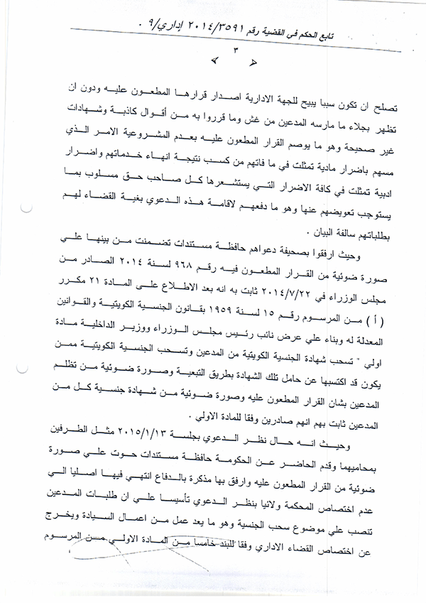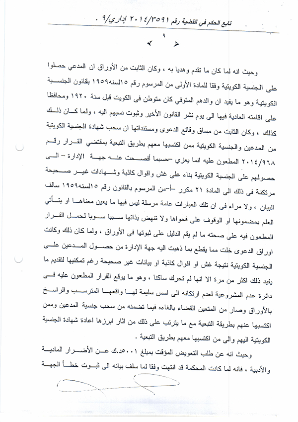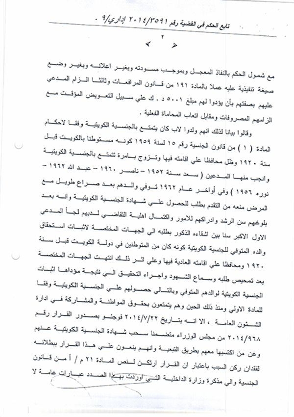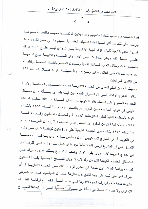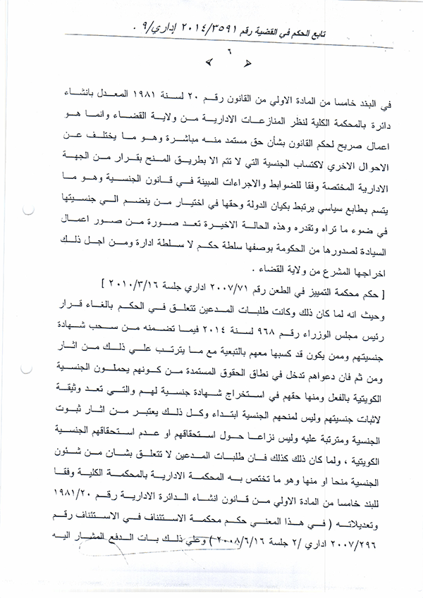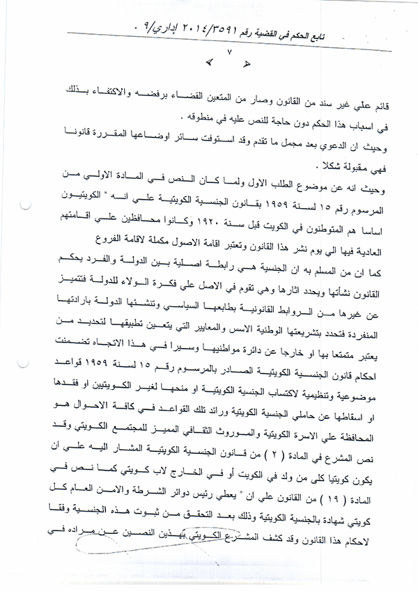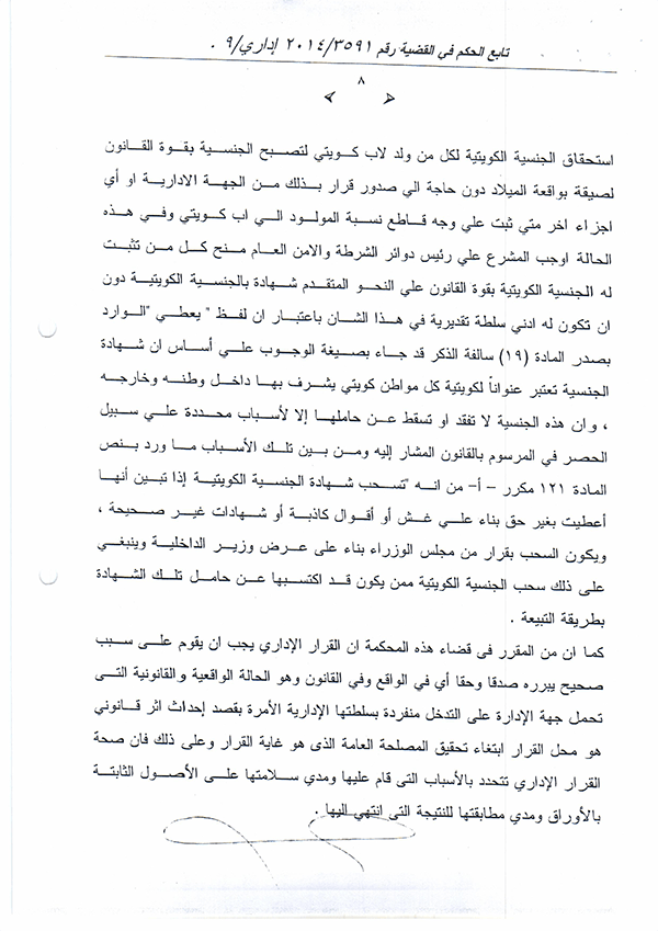 وأكد الحكم بأن المولود لأب كويتي هو كويتي الجنسية بقوة القانون دون الحاجة لقرار من جهة إدارية، فيما أن قضية البرغش ليست مسألة من مسائل الجنسية التي استبعد المشرّع النظر فيها.