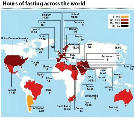 وفقاً للخارطة العالمية، تضم قائمة الدول التي ستشهد أطول فترات الصيام ايسلندا والسويد والنرويج بحوالي 20 ساعة.