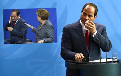 واختتم السيسي يومه السيئ بتعرضه لموقف محرج طالما حاول تفاديه، حيث طاردته لعنة مذبحة رابعة في برلين أمام كاميرات التلفزيون، حينما هتفت فتاة مصرية من بين الحاضرين أثناء المؤتمر الصحفي بهتافات منددة بالسيسي، واتهمته بأنه سفاح ونازي، ورفعت شارة رابعة في وجهه، قبل أن يسارع رجال الأمن إلى إخراجها من القاعة.