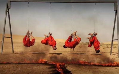 نشر تنظيم داعش الإرهابي فيديو جديد يظهر قيامه بإعدام 4 أشخاص قال إنهم من “الحشد الشعبي” وذلك عن طريق حرقهم بعد توثيقهم على أرجوحة.
