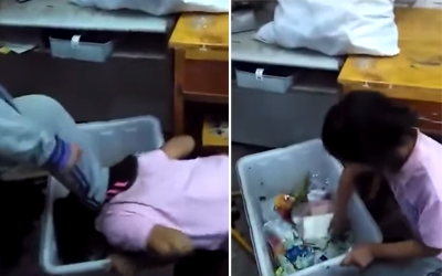 التقط مقطع فيديو صادم لطالبة صينية أجبرت على تناول الفضلات من سلة القمامة من قبل زميلاته داخل فصل بإحدى المدارس الصينية، وسط ضحكات وسخرية بقية الطلاب.