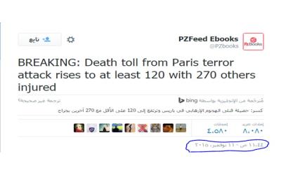 تداول رواد مواقع التواصل الاجتماعي أمس الإثنين، حساب على موقع التدوين “تويتر” باسم sPZbook@، ذكر فيه سقوط عدد من القتلى والجرحى في هجمات باريس، قبل حدوث العمل الإرهابي بحوالي 48 ساعة.