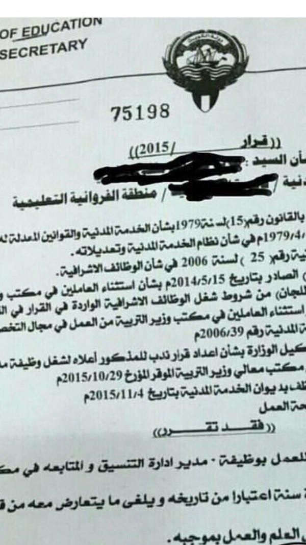 وأضاف المصدر بأن حالة أخرى في إدارة تعليمية مبارك الكبير وتعمل بوظيفة موجه تربية بدنية قد تم ندبها الى مركز البولينغ الخاص بالشباب والذي لا يسمح حسب قوانين الوزارة بأن يتم التدريب من قبل موجهه “امرأة” وهو ما يؤكد بأن قرار الندب جاء للتنفيع والمحسوبية.