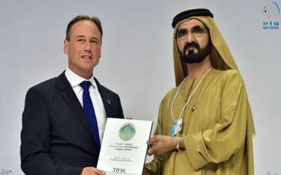 كرم نائب رئيس دولة الإمارات العربية المتحدة ورئيس مجلس الوزراء حاكم دبي الشيخ محمد بن راشد آل مكتوم أمس وزير البيئة والقائم بأعمال وزير المدن والبيئة العمرانية في أستراليا غريغ هانت بجائزة “أفضل وزير في العالم، ضمن فعاليات اليوم الثاني من القمة العالمية للحكومات في دبي.