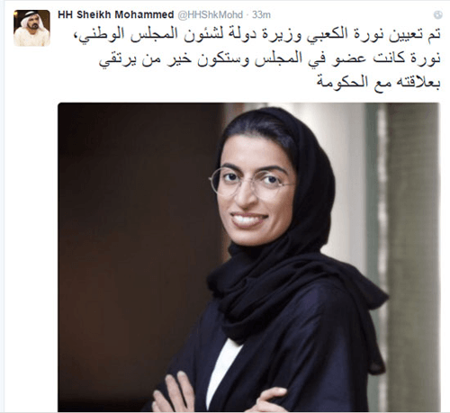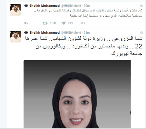 واستمر “تم تعيين نورة الكعبي وزيرة دولة لشئون المجلس الوطني، نورة كانت عضو في المجلس وستكون خير من يرتقي بعلاقته مع الحكومة ” . واستطرد محمد بن راشد “شما المزروعي .. وزيرة دولة لشؤون الشباب.. شما عمرها 22 .. ولديها ماجستير من أكسفورد .. وبكالوريس من جامعة نيويورك ، شما ستكون أيضا رئيسة مجلس الشباب الذي سيمثل تطلعات وقضايا الشباب لدى الحكومة .. سنعطيها صلاحيات وأتوقع منها ومن مجلسها إنجازات حقيقية”.