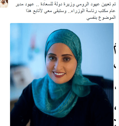 كما كشف حاكم دبي عن تعيين عهود الرومي وزيرة دولة للسعادة قائلاً: “عهود مدير عام مكتب رئاسة الوزراء.. وستبقى معي لأتابع هذا الموضوع بنفسي.”