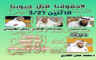 حيث تنظم ندوة بعنوان “حقوقنا قبل جيوبنا” يتحدث فيها كل من النواب السابقين : خالد السلطان وعبدالرحمن العنجري ورياض العدساني.