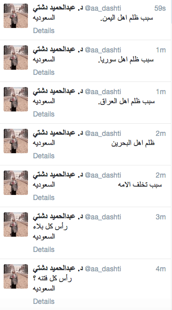 وأتهم دشتي السعودية بأنها، حسب تعبيره، “رأس كل فتنة” و”رأس كل بلاء” و”سبب تخلف الأمة” وأنها، أي السعودية، وراء ظلم أهل البحرين وسوريا والعراق واليمن بحسب تغريدات دشتي.