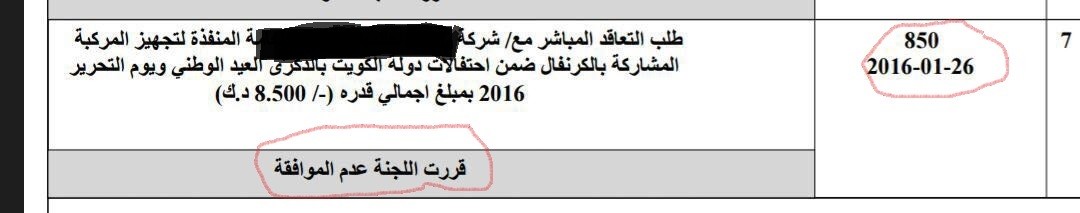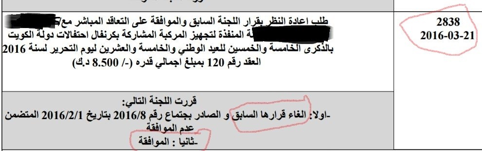 وفي تفاصيل الخبر فقد صرح مصدر للجريدة عن قيام أحد المسئولين بالتعاون مع شركة تم إيقاف ملفها من قبل غرفة تجارة وصناعة الكويت لتكليفها بالقيام بأعمال تجهيزات مركبة احتفالات بمناسبة الأعياد الوطنية التي أقيمت في شهر فبراير الماضي، حيث قامت اللجنة المختصة بهذا الشأن برفض الموضوع بالاجتماع الأول والذي عقد في شهر يناير أي قبل فترة الاحتفالات الوطنية، إلا أن المسئول قام بإعادة فتح الموضوع مره أخرى وعرض المشروع على اللجنة في بداية شهر فبراير والتي أيضا قامت اللجنة برفضها لأسباب عدة أولها المبالغة في المبلغ المخصص لتجهيز المركبة وكذلك عدم وجود أسم الشركة ضمن الشركات المدرجة بملفها المقفل لدى غرفة التجارة والصناعة، إلا أنه لم يدخل اليأس في حسبان صفقته حيث قام بإعادة طرحها أمام اللجنة باجتماعها المنعقد بتاريخ 21/3/2016 أي بعد انتهاء فترة الاحتفالات، والتي بدورها وافقت على الصفقة وإلغاء القرار السابق وهو ما يثير الدهشة والغرابة لدى الكثير، عن كيفية عدول اللجنة عن رفضها في السابق وموافقتها الآن بعد انتهاء فترة الاحتفالات.