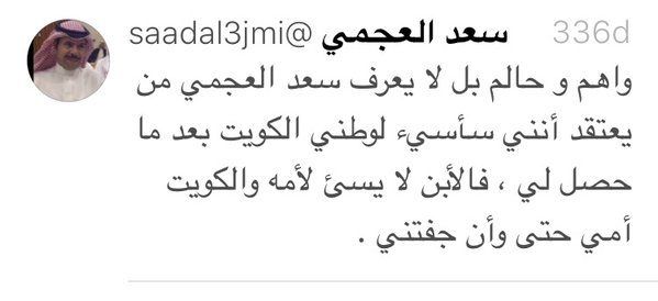 عموماً.. إن كنت تعتبر كلامي – عن عبدالحميد دشتي ومطالبتي بمحاسبته لتعديه الخطوط الحمراء ضد السعودية – إساءة للكويت وحكامها فهذا شأنك، وإن كنت تعتبر تحذيري من إيران وأذنابها من حزب الله في الكويت وحديثي عن خلية حزب الله المقبوض عليها هو إساءة للكويت وحكامها فهذا شأنك، وإن كنت تعتبر دعوتي لعروبة بلدي الكويت والحرص على تضامنها مع محيطها الخليجي وهو الحامي بعد الله لها إساءة للكويت وحكامها فهذا شأنك.