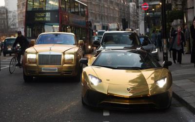 ينشغل سكان لندن هذه الأيام بالحديث عن ملياردير خليجي تحولت سياراته إلى حديث العامة في المجالس والمقاهي والحانات، بسبب أنها مطلية بالذهب وتحمل لوحات خليجية، ويشحنها صاحبها الملياردير معه من دولته الخليجية إلى لندن بطائرة خاصة ليستخدمها خلال قضاء إجازته في بريطانيا.