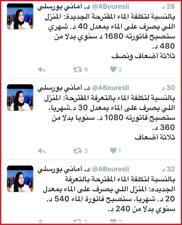 وتناولت د.أماني بورسلي في تغريدتها أثر المقترح الحكومي لزيادة أسعار “الكهرباء والماء” على المستهلك بحيث تكون على النحو الموضح في تغريداتها المصورة التالية :
