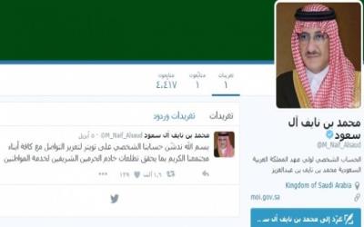 دشن الأمير محمد بن نايف ولي العهد السعودي نائب رئيس مجلس الوزراء وزير الداخلية، حسابه الشخصي على موقع التواصل الاجتماعي «تويتر» تحت اسم ( @M_Naif_Alsaud).