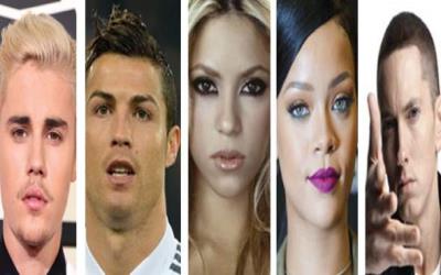 1- المغني الكندي الشاب جاستين بيبر يتمتع بشعبية جارفة بين مراهقي العالم، بيبر لديه أكثر من 76 مليون متابع على موقع الفيسبوك بينما وصل عدد متابعيه على موقع تويتر إلى 79 مليون متابع.