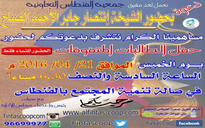 تنظم جمعية الفنطاس التعاونية غداً الخميس حفل الطالبات المتفوقات في صالة تنمية المجتمع بالفنطاس الساعة الـ6 والنصف مساء.