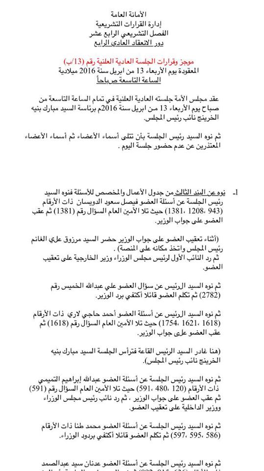 رغم نفي بعض أعضاء مجلس الصوت الواحد موافقتهم على وثيقة الإصلاح الإقتصادي المقدمة من قبل الحكومة بشأن رؤيتها التي تتضمن الكثير من النقاط التي ستستهدف طبقة ذوي الدخل المحدود في الكويت، وتفتح المجال واسعاً لتخصيص الشركات الحكومية الناجحة، تنشر سبر كامل نص مضبطة جلسة 13 ابريل والتي صادق عليها المجلس في جلسته العادية أمس.