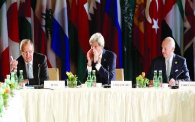 وكثف النظام عملياته في حلب وإدلب تزامنًا مع انطلاق مؤتمر الدول الداعمة لسوريا في فيينا، أمس، وهو الاجتماع الذي استغرق ساعات من دون تحقيق أي انفراج كبير. وصرح وزيرا الخارجية الأميركي جون كيري والروسي سيرغي لافروف، بأن المجموعة الدولية لدعم سوريا التي تشترك موسكو وواشنطن في رئاستها، اتفقت على تعزيز وقف إطلاق النار. إلا أن الخلافات بين واشنطن وموسكو حول كيفية التعامل مع الأزمة كانت واضحة، حيث أخفقت الأمم المتحدة في تحديد موعد جديد لاستئناف محادثات السلام.