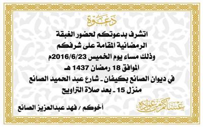 يقيم عضو مجلس البلدي فهد الصانع غبقته الرمضانية في ديوان الصانع بكيفان – شارع عبدالحميد الصانع منزل 15 – يوم الخميس المقبل 18 رمضان بعد صلاة التراويح.