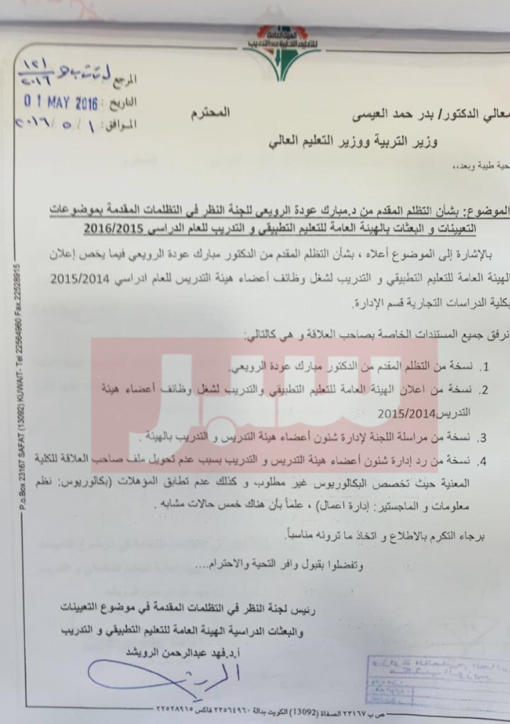 وأكدت المصادر أن الوزير بدر العيسى يبدو أنه قد رضخ لمطالب الرويعي بعد يوم واحد من رفض اللجنة المختصة تعيين (أخ) النائب لعدم مطابقته لشروط التعيين ، وطالب الوزير بتعيينه في كتاب موجه من مكتب الوزير إلى “التطبيقي” مختوما بـ “عاجل جدا وخاص وسري”..