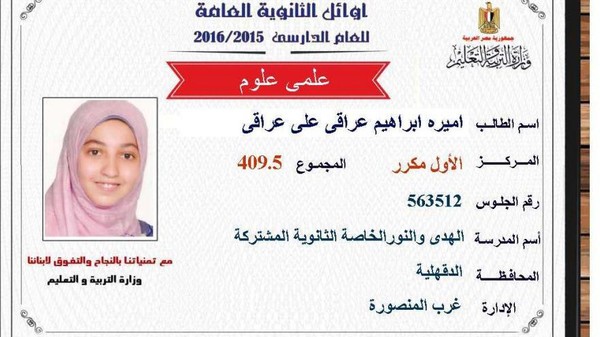 كشف إعلان وزير التعليم المصري لأسماء الأوائل على الثانوية العامة عن حصول ابنة قيادي #إخواني محكوم عليه بالمؤبد على المركز الأول مكرر علمي علوم وهي الطالبة #أميرة_إبراهيم العراقي من مدينة المنصورة محافظة الدقهلية بدلتا مصر حيث حصلت على مجموع 409,5.