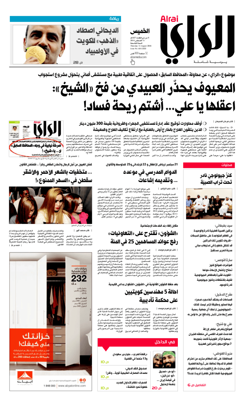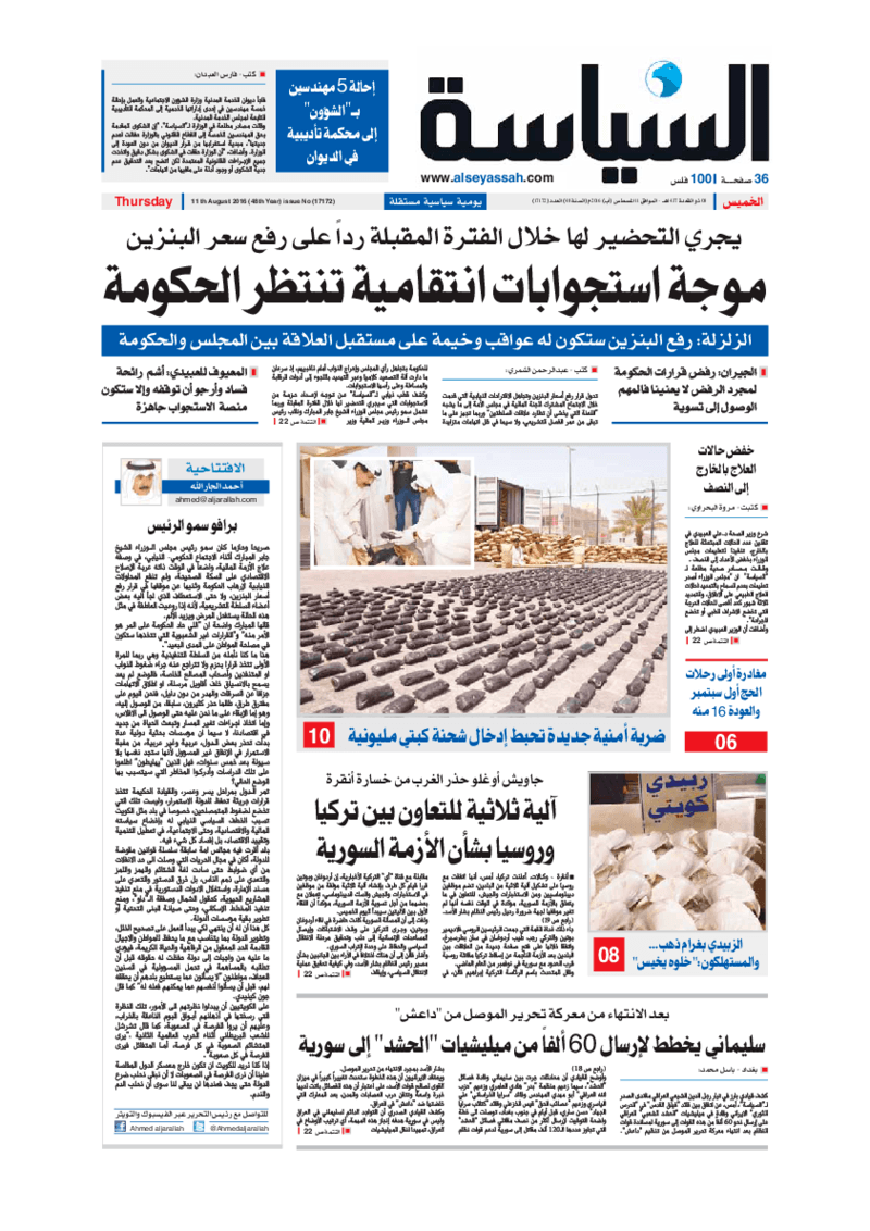 آخر الأخبار جرائم وقضايا “الجمارك” تضبط 29 ألف علبة مشروبات كحولية قادمة من دولة آسيوية في ميناء الشويخ 9 يونيو، 2024 محليات ممثلة عن دولة الكويت الطبيبة الكويتية أسماء الكندري تشارك في المؤتمر العالمي للمناظير في إيطاليا 8 يونيو، 2024 محليات “الصحة”: اكتمال وصول فريق الخدمات الطبية ببعثة الحج الكويتية لمكة المكرمة 8 يونيو، 2024 محليات “الصحة” تحدد 8 مراكز للصحة المدرسية لاستقبال الطلبة المبتعثين 8 يونيو، 2024 عربي وعالمي “الصحة العالمية”: تسجيل أول وفاة لشخص مصاب بـ«أنفلونزا الطيور» 7 يونيو، 2024 محليات عناوين الصحف الكويتية ليوم الخميس 11 أغسطس 2016 محرر المحليات11 أغسطس، 2016أضف تعليق1 دقائق جريدة الجريدة جريدة الأنباء جريدة القبس جريدة السياسة جريدة الوطن جريدة الراي جريدة الوسط جريدة النهار الوسومTop عناوين الصحف المحلية من الممكن أن يعجبك جرائم وقضايا “الجمارك” تضبط 29 ألف علبة مشروبات كحولية قادمة من دولة آسيوية في ميناء الشويخ محليات ممثلة عن دولة الكويت الطبيبة الكويتية أسماء الكندري تشارك في المؤتمر العالمي للمناظير في إيطاليا محليات “الصحة”: اكتمال وصول فريق الخدمات الطبية ببعثة الحج الكويتية لمكة المكرمة محليات “الصحة” تحدد 8 مراكز للصحة المدرسية لاستقبال الطلبة المبتعثين عربي وعالمي “الصحة العالمية”: تسجيل أول وفاة لشخص مصاب بـ«أنفلونزا الطيور» تكنولوجيا رش السحب بملح البحر.. تجربة “ثورية” لتبريد كوكب الأرض أضف تعليق أضغط هنا لإضافة تعليق إلغاء الردالتعليقالاسم البريد الإلكتروني الموقع الإلكتروني Δ هذا الموقع يستخدم خدمة أكيسميت للتقليل من البريد المزعجة. اعرف المزيد عن كيفية التعامل مع بيانات التعليقات الخاصة بك processed.