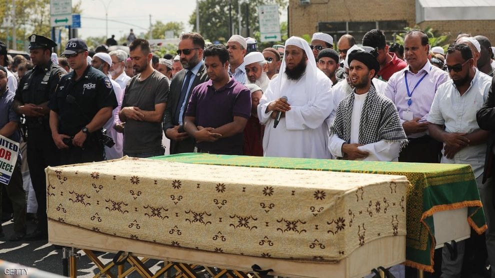 تجمع مئات المشيعين في مدينة نيويورك، الاثنين، لحضور جنازة إمام مسجد ومساعده، قتلا السبت الماضي، بينما استجوبت الشرطة رجلا بشأن الحادث.