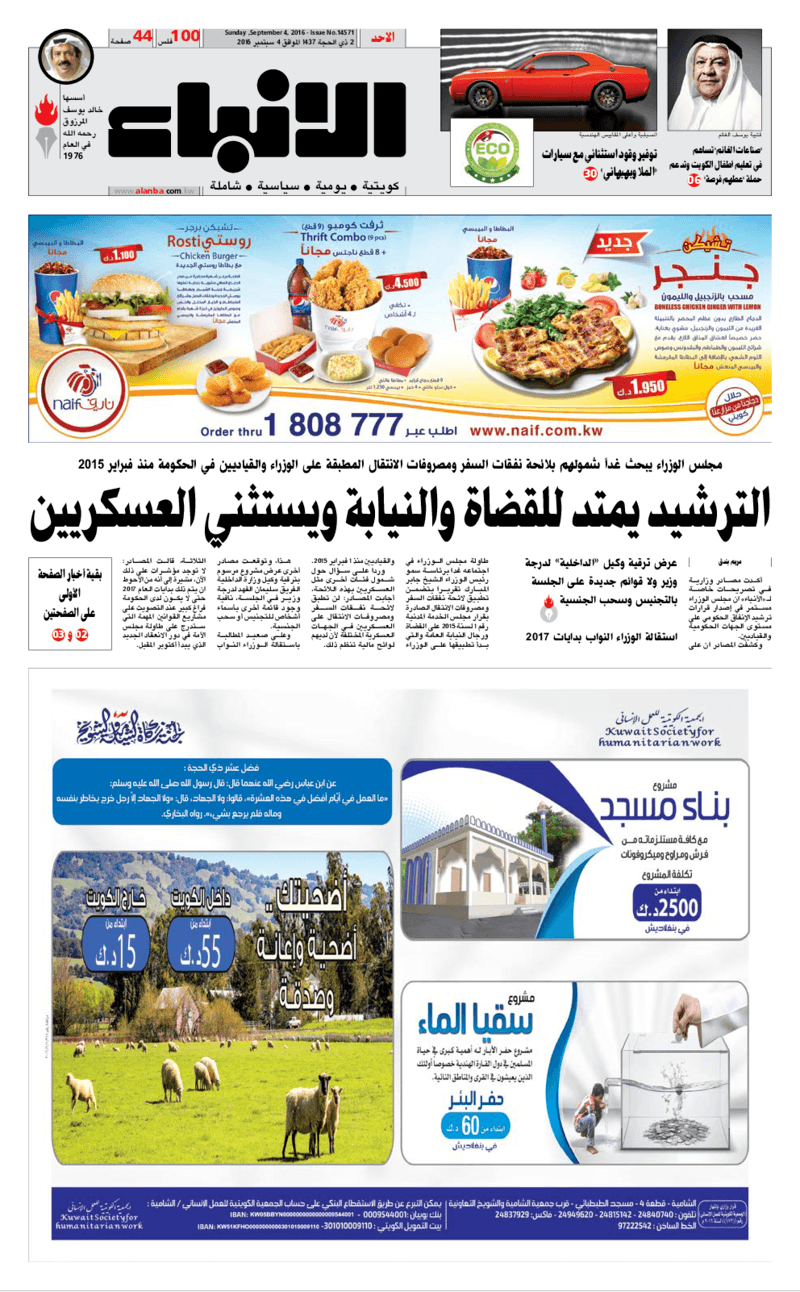 آخر الأخبار جرائم وقضايا “الجمارك” تضبط 29 ألف علبة مشروبات كحولية قادمة من دولة آسيوية في ميناء الشويخ 9 يونيو، 2024 محليات ممثلة عن دولة الكويت الطبيبة الكويتية أسماء الكندري تشارك في المؤتمر العالمي للمناظير في إيطاليا 8 يونيو، 2024 محليات “الصحة”: اكتمال وصول فريق الخدمات الطبية ببعثة الحج الكويتية لمكة المكرمة 8 يونيو، 2024 محليات “الصحة” تحدد 8 مراكز للصحة المدرسية لاستقبال الطلبة المبتعثين 8 يونيو، 2024 عربي وعالمي “الصحة العالمية”: تسجيل أول وفاة لشخص مصاب بـ«أنفلونزا الطيور» 7 يونيو، 2024 محليات عناوين الصحف الكويتية ليوم الأحد 04 سبتمبر 2016 محرر المحليات4 سبتمبر، 2016أضف تعليق1 دقائق جريدة الأنباء جريدة القبس جريدة السياسة جريدة الراي جريدة الوسط جريدة النهار الوسومTop عناوين الصحف المحلية من الممكن أن يعجبك جرائم وقضايا “الجمارك” تضبط 29 ألف علبة مشروبات كحولية قادمة من دولة آسيوية في ميناء الشويخ محليات ممثلة عن دولة الكويت الطبيبة الكويتية أسماء الكندري تشارك في المؤتمر العالمي للمناظير في إيطاليا محليات “الصحة”: اكتمال وصول فريق الخدمات الطبية ببعثة الحج الكويتية لمكة المكرمة محليات “الصحة” تحدد 8 مراكز للصحة المدرسية لاستقبال الطلبة المبتعثين عربي وعالمي “الصحة العالمية”: تسجيل أول وفاة لشخص مصاب بـ«أنفلونزا الطيور» تكنولوجيا رش السحب بملح البحر.. تجربة “ثورية” لتبريد كوكب الأرض أضف تعليق أضغط هنا لإضافة تعليق إلغاء الردالتعليقالاسم البريد الإلكتروني الموقع الإلكتروني Δ هذا الموقع يستخدم خدمة أكيسميت للتقليل من البريد المزعجة. اعرف المزيد عن كيفية التعامل مع بيانات التعليقات الخاصة بك processed.