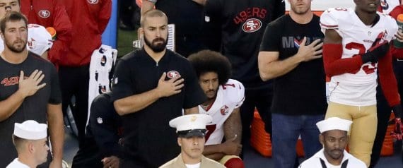 لاعب خط الوسط كولن كيبرنيك، الذي يلعب مع فريق San Francisco 49ers، بدأ وقفته الاحتجاجية أثناء المباراة الودية لموسم كرة القدم الذي يوشك على البدء، عندما اختار الركوع على ركبتيه بدلاً من الوقوف أثناء عزف النشيد الوطني لأميركا.