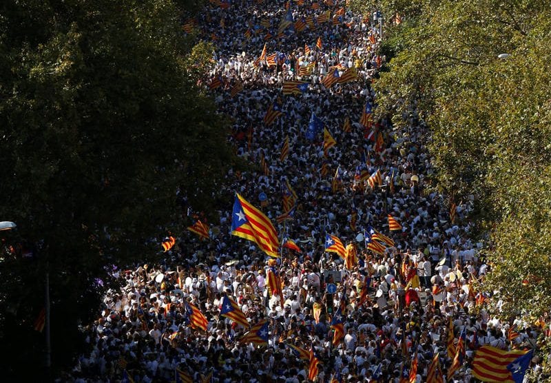 وشارك اكثر من 340 الف شخص في التظاهرات التي تزامنت مع اليوم الوطني لكاتالونيا الذي يحيي ذكرى غزو الملك الاسباني فيليب الخامس لبرشلونة في 1714 بعد حصار استمر 13 شهرا ما ادى الى خسارة كاتالونيا للحكم الذاتي.