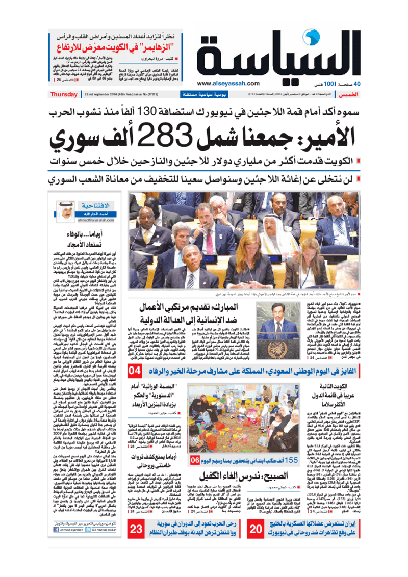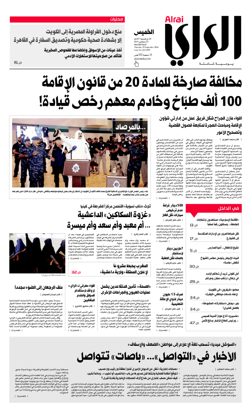 آخر الأخبار جرائم وقضايا “الجمارك” تضبط 29 ألف علبة مشروبات كحولية قادمة من دولة آسيوية في ميناء الشويخ 9 يونيو، 2024 محليات ممثلة عن دولة الكويت الطبيبة الكويتية أسماء الكندري تشارك في المؤتمر العالمي للمناظير في إيطاليا 8 يونيو، 2024 محليات “الصحة”: اكتمال وصول فريق الخدمات الطبية ببعثة الحج الكويتية لمكة المكرمة 8 يونيو، 2024 محليات “الصحة” تحدد 8 مراكز للصحة المدرسية لاستقبال الطلبة المبتعثين 8 يونيو، 2024 عربي وعالمي “الصحة العالمية”: تسجيل أول وفاة لشخص مصاب بـ«أنفلونزا الطيور» 7 يونيو، 2024 محليات عناوين الصحف الكويتية ليوم الخميس 22 سبتمبر 2016 محرر المحليات22 سبتمبر، 2016أضف تعليق1 دقائق جريدة الجريدة جريدة الأنباء جريدة القبس جريدة السياسة جريدة الراي جريدة الوسط الوسومTop عناوين الصحف المحلية من الممكن أن يعجبك جرائم وقضايا “الجمارك” تضبط 29 ألف علبة مشروبات كحولية قادمة من دولة آسيوية في ميناء الشويخ محليات ممثلة عن دولة الكويت الطبيبة الكويتية أسماء الكندري تشارك في المؤتمر العالمي للمناظير في إيطاليا محليات “الصحة”: اكتمال وصول فريق الخدمات الطبية ببعثة الحج الكويتية لمكة المكرمة محليات “الصحة” تحدد 8 مراكز للصحة المدرسية لاستقبال الطلبة المبتعثين عربي وعالمي “الصحة العالمية”: تسجيل أول وفاة لشخص مصاب بـ«أنفلونزا الطيور» تكنولوجيا رش السحب بملح البحر.. تجربة “ثورية” لتبريد كوكب الأرض أضف تعليق أضغط هنا لإضافة تعليق إلغاء الردالتعليقالاسم البريد الإلكتروني الموقع الإلكتروني Δ هذا الموقع يستخدم خدمة أكيسميت للتقليل من البريد المزعجة. اعرف المزيد عن كيفية التعامل مع بيانات التعليقات الخاصة بك processed.
