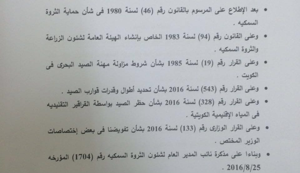 وتضمن القرار مخالفة كل من يتجاوز، ويطبق عليه الأحكام والعقوبات المنصوص عليها بالمرسوم بقانون رقم 40 لسنة 1980 بشأن حماية الثروة السمكية والقرارات المنفذة لها.