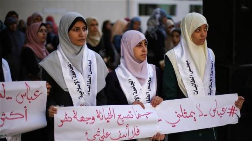 رفعت المشاركات في الوقفة التي دعت لها الكتلة الإسلامية”، الإطار الطلابي لحركة “حماس”، في الجامعة الإسلامية بغزة، لافتات كُتب على بعضها “لا لمجاملة اسرائيل”، و” من باع شبرا من بلادي بعته وبلا ثمن”.