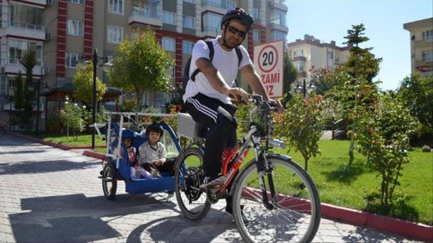 صمم مهندس كمبيوتر تركي، دراجة هوائية تعمل بالطاقة الشمسية، مزودة بعربة لحمل أطفاله، لكي يتمكن من تمضية وقت ممتع أطول معهم.