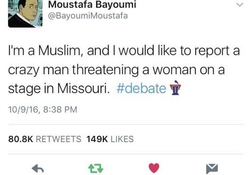 وردَّ دونالد ترامب قائلاً: “إن على المسلمين أن يبلّغوا عن أي شيء يشاهدونه، أي حادث كراهية أو أي شيء من هذا القبيل”. مضيفًا بأن هناك تطرفًا وإرهابًا إسلاميًّا، مستشهدًا بهجمات 11 من سبتمبر وحادثة سان بردينيو وغيرهما، فردَّ المدون والمؤلف المصري الأصل مصطفى بيومي أثناء إجابة ترامب على سؤال المسلمة بتغريدة ذكية، كسرت كل أرقام الرتويت في تلك الليلة، قال فيها “أنا مسلم، وأود أن أبلّغ عن رجل مجنون يهدد امرأة على المسرح في ميزوري!”، في تلميح مباشر إلى تهجُّم ترامب على هيلاري كلينتون في المناظرة الرئاسية.
