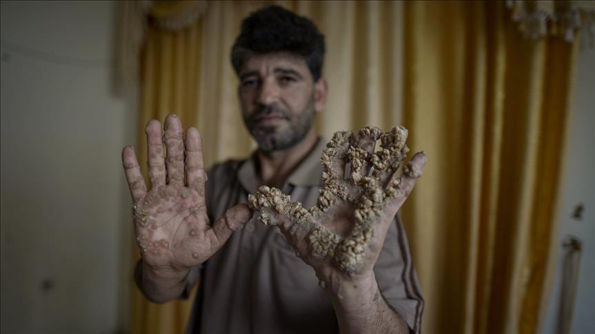 منذ سنوات تحولت يد رجل فلسطيني في قطاع غزة، إلى ما يشبه جذع شجرة صغيرة، بسبب ظهور نتوءات كبيرة عليها، أدت إلى اختفاء أي ملامح تدل على وجود أصابع يده.