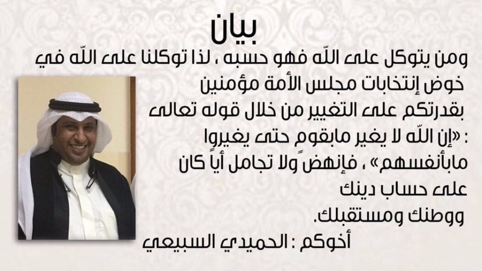 وقال السبيعي في بيان تم نشره على موتقع التواصل الاجتماعي “إن الله لا يغير ما بقوم حتى يغيروا ما بأنفسهم”، فانهض ولا تجامل أحداً على حساب دينك ووطنك ومستقبلك.