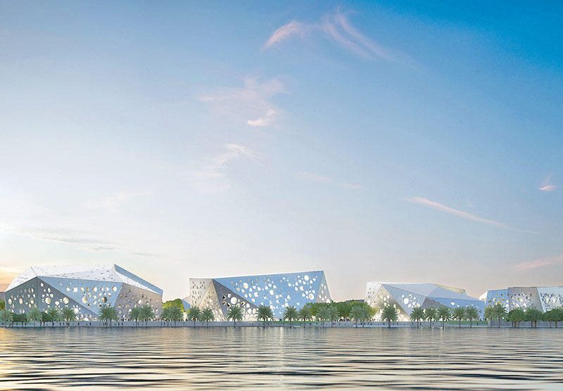 والجواهر المتلألئة هي مبنى المسرح العالمي الذي شيد على مساحة 10000 متر مربع، ويتكون من سردابين ودور أرضي و4 طوابق تضم مسرحا كبيرا يتسع لـ2000 كرسي، ووسط يتسع لـ700 كرسي، ومسرح صغير يتسع لـ200 كرسي، اضافة الى غرف تغيير ملابس ومكاتب للادارة وقاعات محاضرات، الى جانب غرف استقبال وانتظار واستراحات للفنانين. ومبنى مركز الموسيقى على مسطح 7000 متر مربع ويتكون من مبنى يضم سردابين ودورا ارضيا و4 طوابق تشمل مسرحا كبيرا للحفلات الموسيقية يتسع لـ 1000 كرسي، وآخر صغير للعروض الموسيقية الفردية يتسع لـ300 كرسي، إضافة الى مكتبة للمؤلفات الموسيقية للكبار والصغار وغرف تبديل ملابس ومكاتب للإدارة وغرف استقبال وانتظار واستراحة.