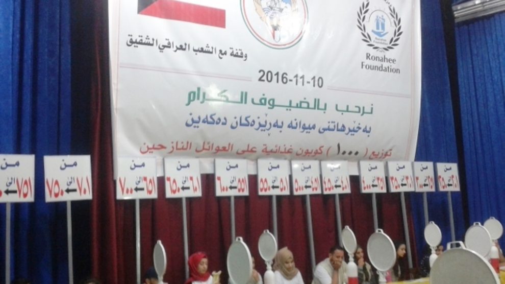 بدورها قالت رئيسة مؤسسة (روناهي) الخيرية زيان ميراني ل (كونا) “قمنا اليوم وبالتعاون مع القنصلية الكويتية في اربيل بتوزيع القسائم الشرائية على النازحين العراقيين وبامكان النازح شراء احتياجاته من الان لمدة شتة اشهر.