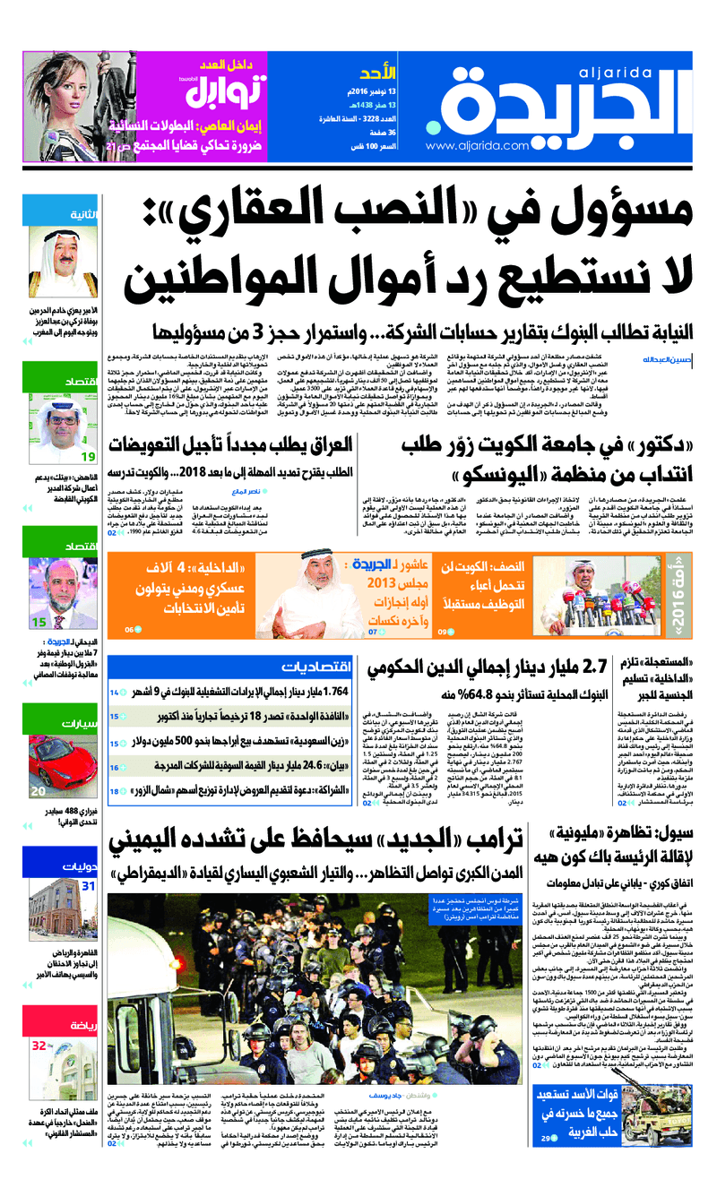 آخر الأخبار جرائم وقضايا “الجمارك” تضبط 29 ألف علبة مشروبات كحولية قادمة من دولة آسيوية في ميناء الشويخ 9 يونيو، 2024 محليات ممثلة عن دولة الكويت الطبيبة الكويتية أسماء الكندري تشارك في المؤتمر العالمي للمناظير في إيطاليا 8 يونيو، 2024 محليات “الصحة”: اكتمال وصول فريق الخدمات الطبية ببعثة الحج الكويتية لمكة المكرمة 8 يونيو، 2024 محليات “الصحة” تحدد 8 مراكز للصحة المدرسية لاستقبال الطلبة المبتعثين 8 يونيو، 2024 عربي وعالمي “الصحة العالمية”: تسجيل أول وفاة لشخص مصاب بـ«أنفلونزا الطيور» 7 يونيو، 2024 محليات عناوين الصحف الكويتية ليوم الأحد 13 نوفمبر 2016 محرر المحليات13 نوفمبر، 2016أضف تعليق1 دقائق جريدة الجريدة جريدة الأنباء جريدة القبس جريدة السياسة جريدة الوطن جريدة الراي جريدة الوسط جريدة النهار الوسومTop عناوين الصحف المحلية من الممكن أن يعجبك جرائم وقضايا “الجمارك” تضبط 29 ألف علبة مشروبات كحولية قادمة من دولة آسيوية في ميناء الشويخ محليات ممثلة عن دولة الكويت الطبيبة الكويتية أسماء الكندري تشارك في المؤتمر العالمي للمناظير في إيطاليا محليات “الصحة”: اكتمال وصول فريق الخدمات الطبية ببعثة الحج الكويتية لمكة المكرمة محليات “الصحة” تحدد 8 مراكز للصحة المدرسية لاستقبال الطلبة المبتعثين عربي وعالمي “الصحة العالمية”: تسجيل أول وفاة لشخص مصاب بـ«أنفلونزا الطيور» تكنولوجيا رش السحب بملح البحر.. تجربة “ثورية” لتبريد كوكب الأرض أضف تعليق أضغط هنا لإضافة تعليق إلغاء الردالتعليقالاسم البريد الإلكتروني الموقع الإلكتروني Δ هذا الموقع يستخدم خدمة أكيسميت للتقليل من البريد المزعجة. اعرف المزيد عن كيفية التعامل مع بيانات التعليقات الخاصة بك processed.