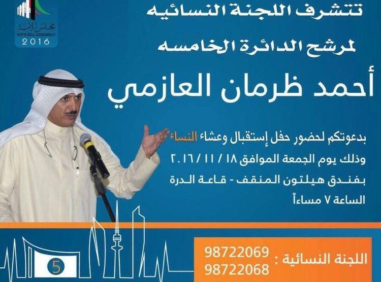 يقيم مرشح الدائرة الخامسة أحمد ظرمان العازمي، حفل استقبال وعشاء على شرف نساء الدائرة، اليوم الجمعة، بفندق هيلتون المنقف قاعة الدرة الساعة 7 مساءا.