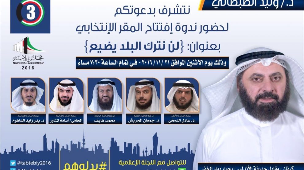 يفتتح مرشح الدائرة الثالثة النائب السابق د.وليد الطبطبائي مقره الانتخابي غداً الإثنين الموافق 21 / 11 / 2016