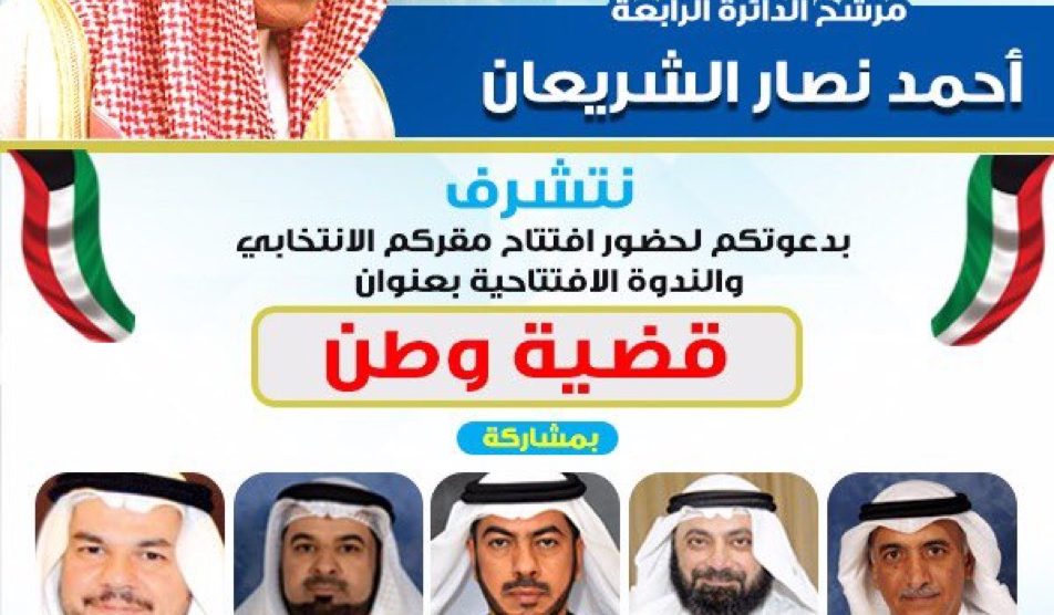 يقيم مرشح الدائرة الرابعة النائب السابق أحمد نصار الشريعان ندوة بعنوان (قضية وطن) يتحدث فيها كل من : شعيب المويزري، د.وليد الطبطبائي، علي الدقباسي، مبارك الوعلان و د.طارق العلوي.