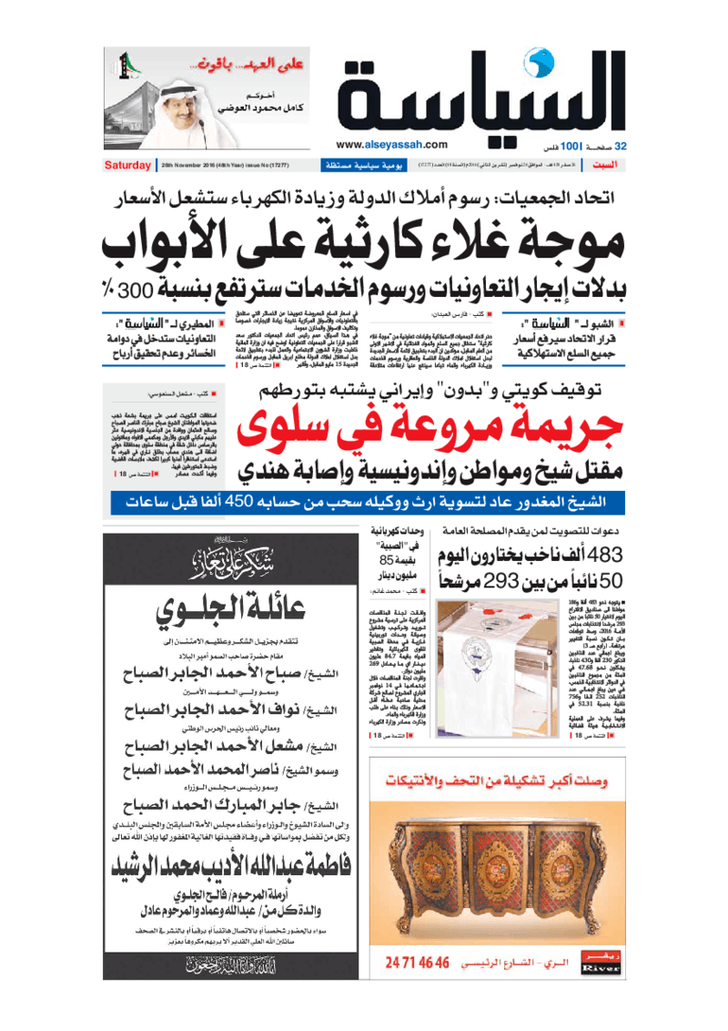 آخر الأخبار جرائم وقضايا “الجمارك” تضبط 29 ألف علبة مشروبات كحولية قادمة من دولة آسيوية في ميناء الشويخ 9 يونيو، 2024 محليات ممثلة عن دولة الكويت الطبيبة الكويتية أسماء الكندري تشارك في المؤتمر العالمي للمناظير في إيطاليا 8 يونيو، 2024 محليات “الصحة”: اكتمال وصول فريق الخدمات الطبية ببعثة الحج الكويتية لمكة المكرمة 8 يونيو، 2024 محليات “الصحة” تحدد 8 مراكز للصحة المدرسية لاستقبال الطلبة المبتعثين 8 يونيو، 2024 عربي وعالمي “الصحة العالمية”: تسجيل أول وفاة لشخص مصاب بـ«أنفلونزا الطيور» 7 يونيو، 2024 محليات عناوين الصحف الكويتية ليوم السبت 26 نوفمبر 2016 محرر المحليات26 نوفمبر، 2016أضف تعليق1 دقائق جريدة الجريدة جريدة الأنباء جريدة القبس جريدة السياسة جريدة الراي جريدة الوسط جريدة النهار الوسومTop عناوين الصحف المحلية من الممكن أن يعجبك جرائم وقضايا “الجمارك” تضبط 29 ألف علبة مشروبات كحولية قادمة من دولة آسيوية في ميناء الشويخ محليات ممثلة عن دولة الكويت الطبيبة الكويتية أسماء الكندري تشارك في المؤتمر العالمي للمناظير في إيطاليا محليات “الصحة”: اكتمال وصول فريق الخدمات الطبية ببعثة الحج الكويتية لمكة المكرمة محليات “الصحة” تحدد 8 مراكز للصحة المدرسية لاستقبال الطلبة المبتعثين عربي وعالمي “الصحة العالمية”: تسجيل أول وفاة لشخص مصاب بـ«أنفلونزا الطيور» تكنولوجيا رش السحب بملح البحر.. تجربة “ثورية” لتبريد كوكب الأرض أضف تعليق أضغط هنا لإضافة تعليق إلغاء الردالتعليقالاسم البريد الإلكتروني الموقع الإلكتروني Δ هذا الموقع يستخدم خدمة أكيسميت للتقليل من البريد المزعجة. اعرف المزيد عن كيفية التعامل مع بيانات التعليقات الخاصة بك processed.