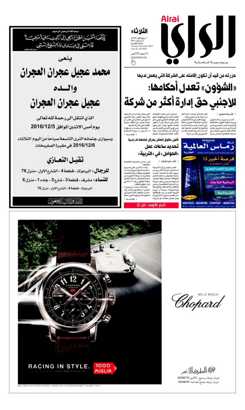 آخر الأخبار جرائم وقضايا “الجمارك” تضبط 29 ألف علبة مشروبات كحولية قادمة من دولة آسيوية في ميناء الشويخ 9 يونيو، 2024 محليات ممثلة عن دولة الكويت الطبيبة الكويتية أسماء الكندري تشارك في المؤتمر العالمي للمناظير في إيطاليا 8 يونيو، 2024 محليات “الصحة”: اكتمال وصول فريق الخدمات الطبية ببعثة الحج الكويتية لمكة المكرمة 8 يونيو، 2024 محليات “الصحة” تحدد 8 مراكز للصحة المدرسية لاستقبال الطلبة المبتعثين 8 يونيو، 2024 عربي وعالمي “الصحة العالمية”: تسجيل أول وفاة لشخص مصاب بـ«أنفلونزا الطيور» 7 يونيو، 2024 محليات عناوين الصحف الكويتية ليوم الثلاثاء 06 ديسمبر 2016 محرر المحليات6 ديسمبر، 2016أضف تعليق1 دقائق جريدة الجريدة جريدة الأنباء جريدة القبس جريدة السياسة جريدة الوطن جريدة الراي جريدة الوسط جريدة النهار الوسومTop عناوين الصحف المحلية من الممكن أن يعجبك جرائم وقضايا “الجمارك” تضبط 29 ألف علبة مشروبات كحولية قادمة من دولة آسيوية في ميناء الشويخ محليات ممثلة عن دولة الكويت الطبيبة الكويتية أسماء الكندري تشارك في المؤتمر العالمي للمناظير في إيطاليا محليات “الصحة”: اكتمال وصول فريق الخدمات الطبية ببعثة الحج الكويتية لمكة المكرمة محليات “الصحة” تحدد 8 مراكز للصحة المدرسية لاستقبال الطلبة المبتعثين عربي وعالمي “الصحة العالمية”: تسجيل أول وفاة لشخص مصاب بـ«أنفلونزا الطيور» تكنولوجيا رش السحب بملح البحر.. تجربة “ثورية” لتبريد كوكب الأرض أضف تعليق أضغط هنا لإضافة تعليق إلغاء الردالتعليقالاسم البريد الإلكتروني الموقع الإلكتروني Δ هذا الموقع يستخدم خدمة أكيسميت للتقليل من البريد المزعجة. اعرف المزيد عن كيفية التعامل مع بيانات التعليقات الخاصة بك processed.